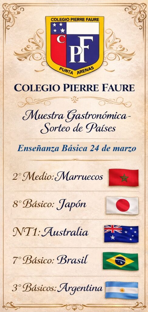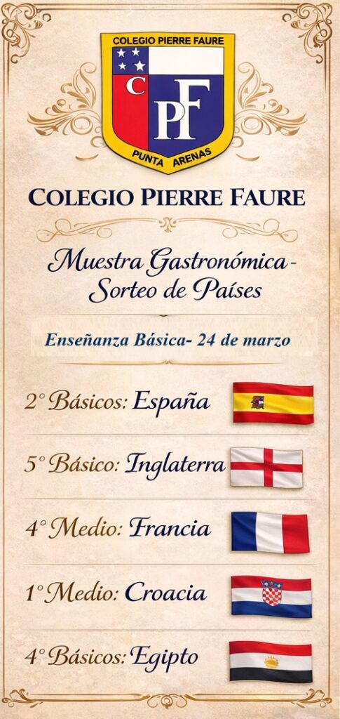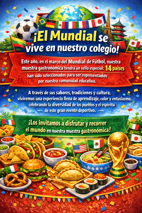 Este año, en el contexto de la celebración del Mundial de Fútbol, nuestro colegio ha querido unir el deporte, la cultura y el aprendizaje en una significativa muestra gastronómica. Por esta razón, se seleccionaron 14 países, los que serán representados por nuestra comunidad educativa a través de sus comidas típicas, tradiciones y elementos culturales más característicos. Esta iniciativa busca promover el conocimiento de diversas culturas del mundo, fortalecer el trabajo colaborativo y vivir con entusiasmo el espíritu de este importante evento deportivo.